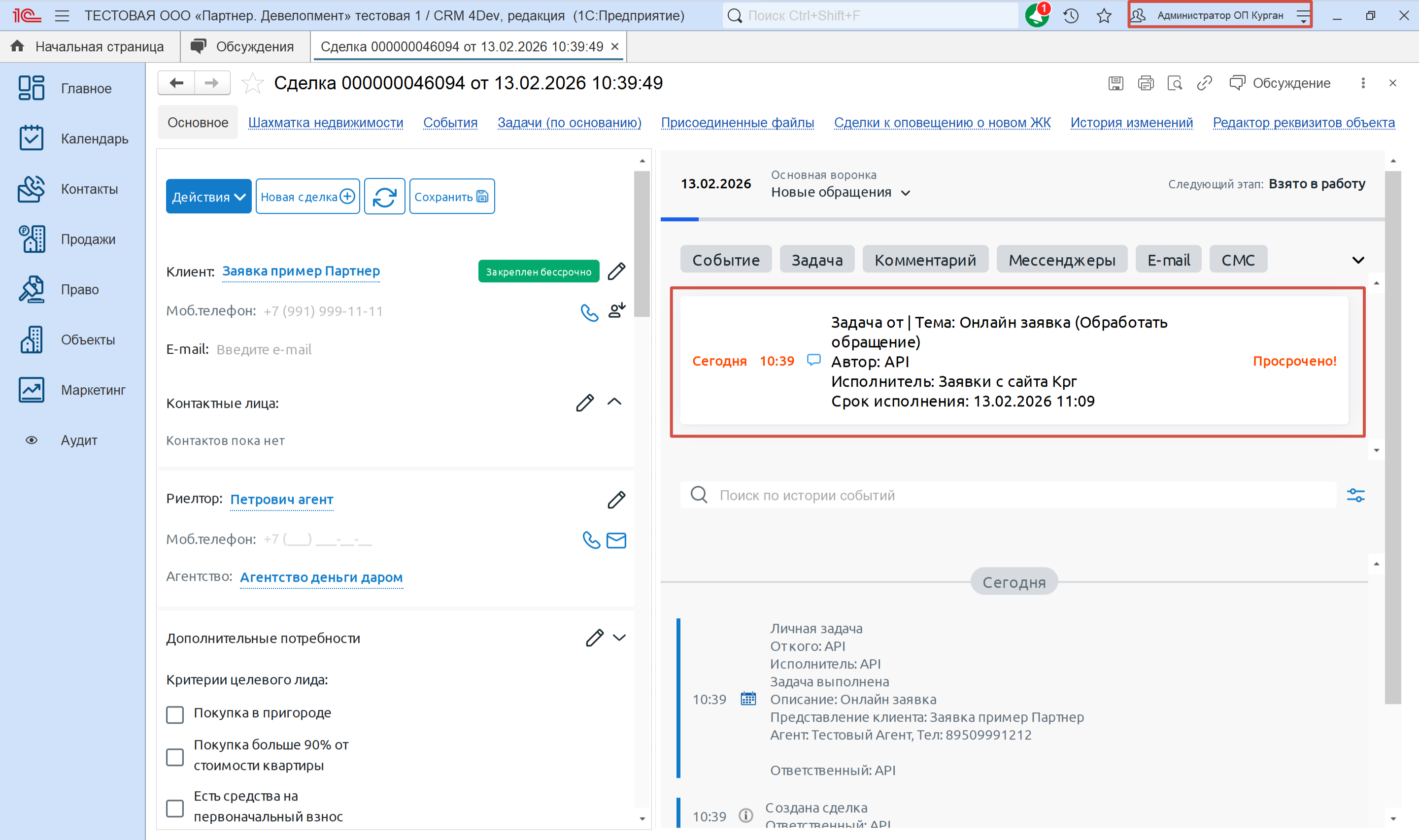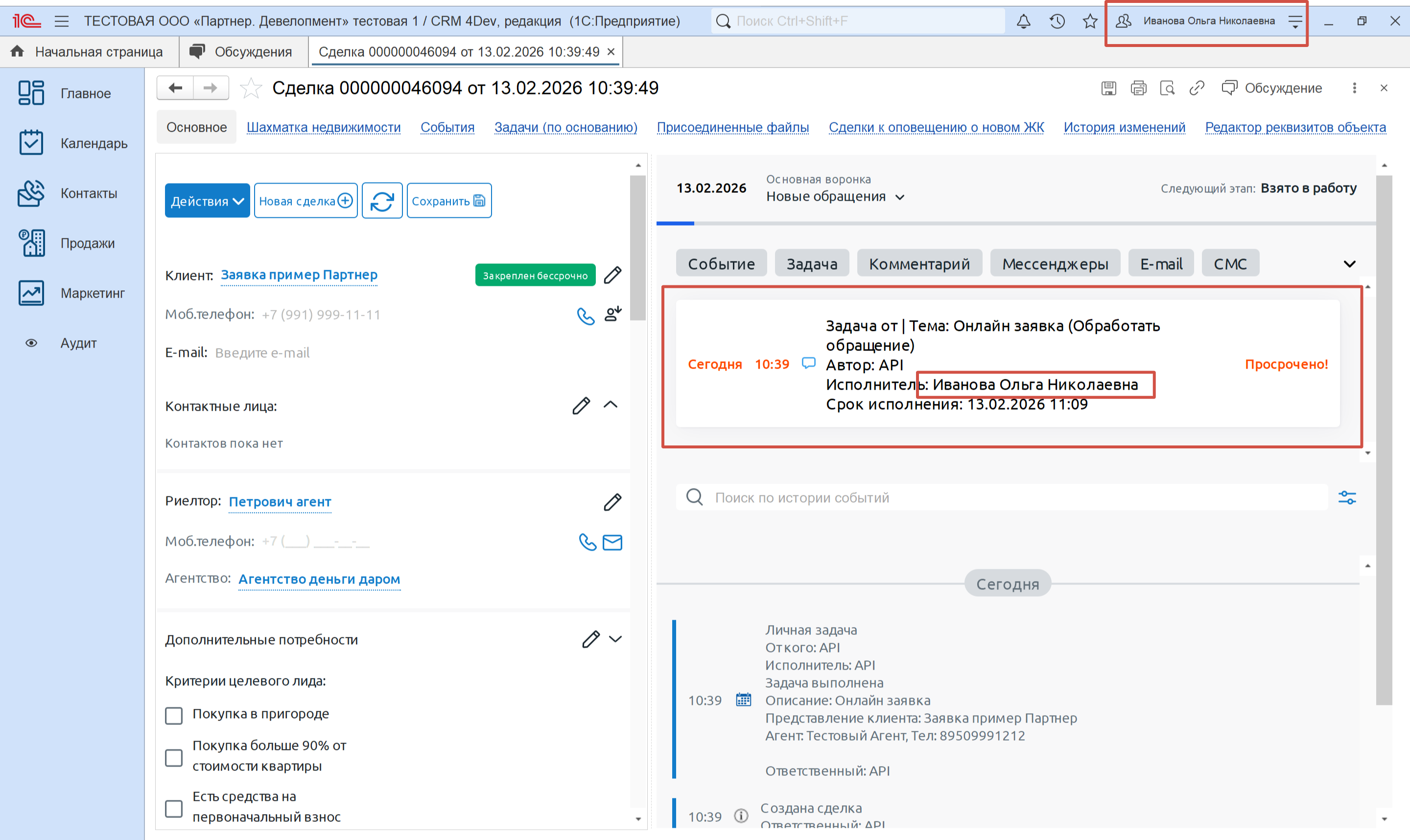 - Клиент отправил заявку в 10:55 → создана задача с дедлайном 13.02.2026 11:09.