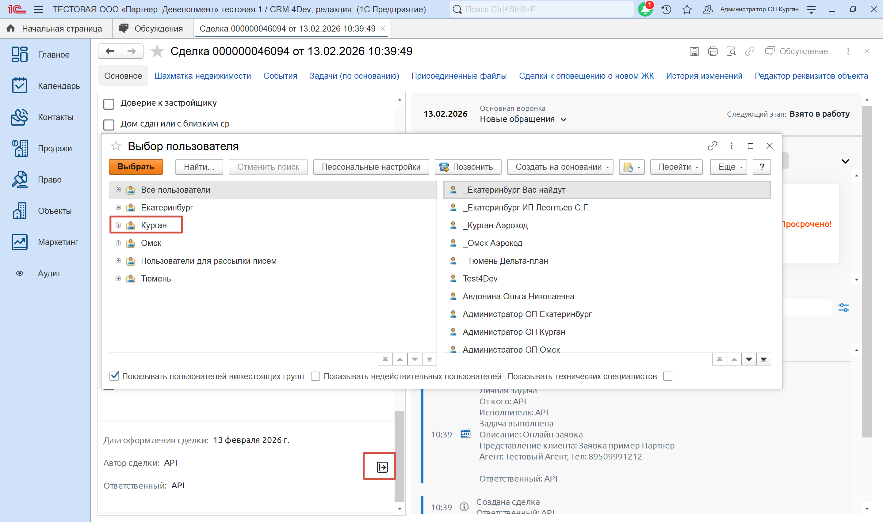 - Пример: Заявка из Кургана → назначена на «Администратор ОП Курган» (см. скриншот ).