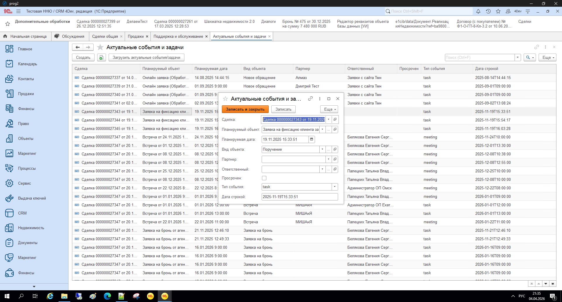 - При записи события в статусе запланировано (задаче в статусе не выполнена) происходит запись фокусных полей в регистр Дев_АктуальныеСобытияЗадачи. После завершения запись строки с событием удаляется, при пометке на удаление тоже. Работает за счет подписки Дев_ЗаполнениеРегистраАктуальныеСобытияЗадачи,