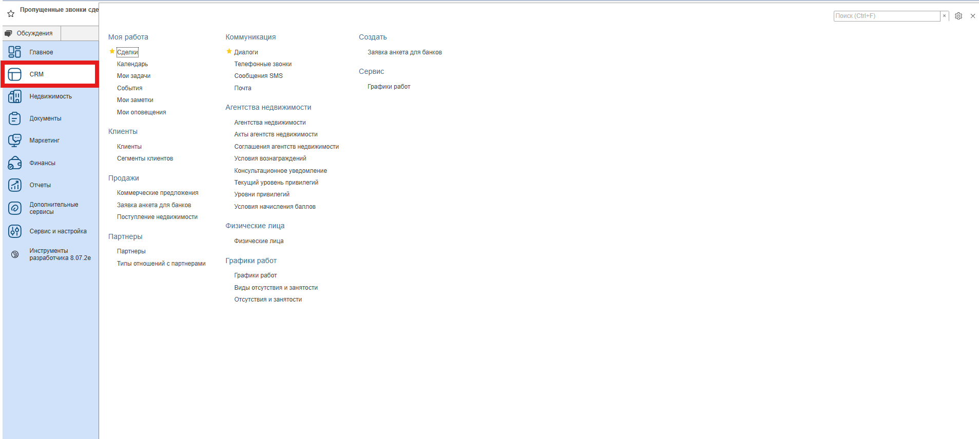По скриншоту и составу конфигурации этот раздел логически связан с рабочим местом менеджера, текущими обсуждениями, клиентами, шахматкой недвижимости и быстрым переходом в операционные разделы.