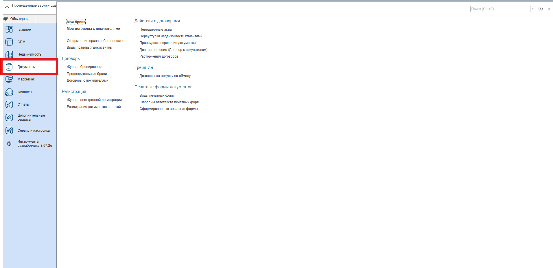 - `Договоры` - заказ клиента, предварительный заказ клиента, реализация недвижимости.