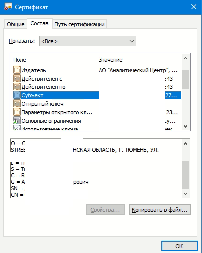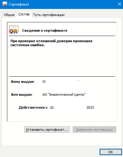 Из сообщений копируем путь «C:\Users\...\.cer» и вставляем в путь на рабочем столе. Выйдет окно сертификата и информация о том успешно ли прошла проверка сертификата или есть какие-то ошибки. Во вкладке «Состав» находим «Субьект» и проверяем доверенное лицо (рис. 3).