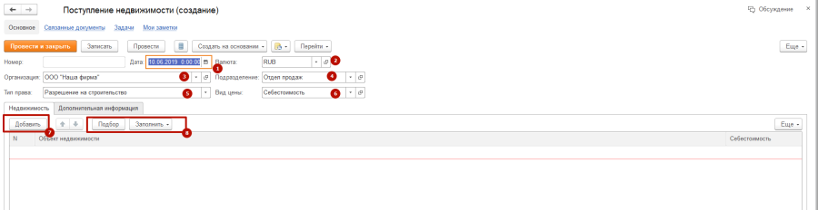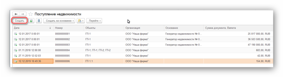 В открывшемся списке нажимаем "Создать" для нового поступления недвижимости. Откроется окно поступления недвижимости.