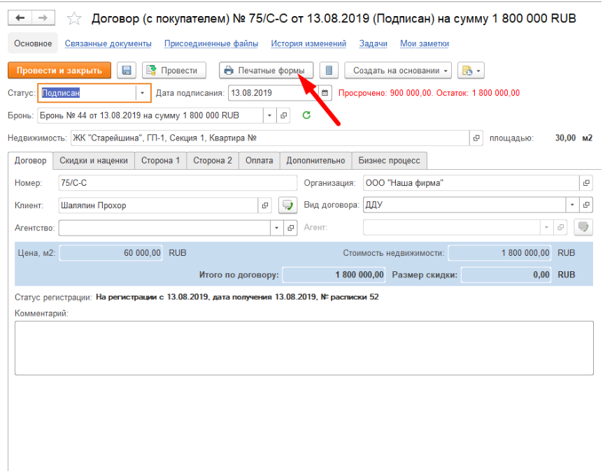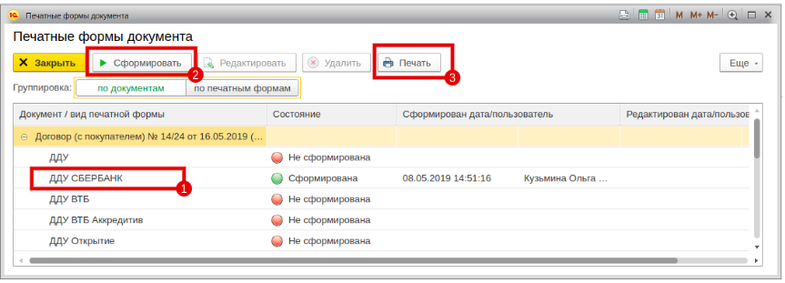 Для формирования печатной формы договора нажмите на "Печатные формы". В появившемся окне:
