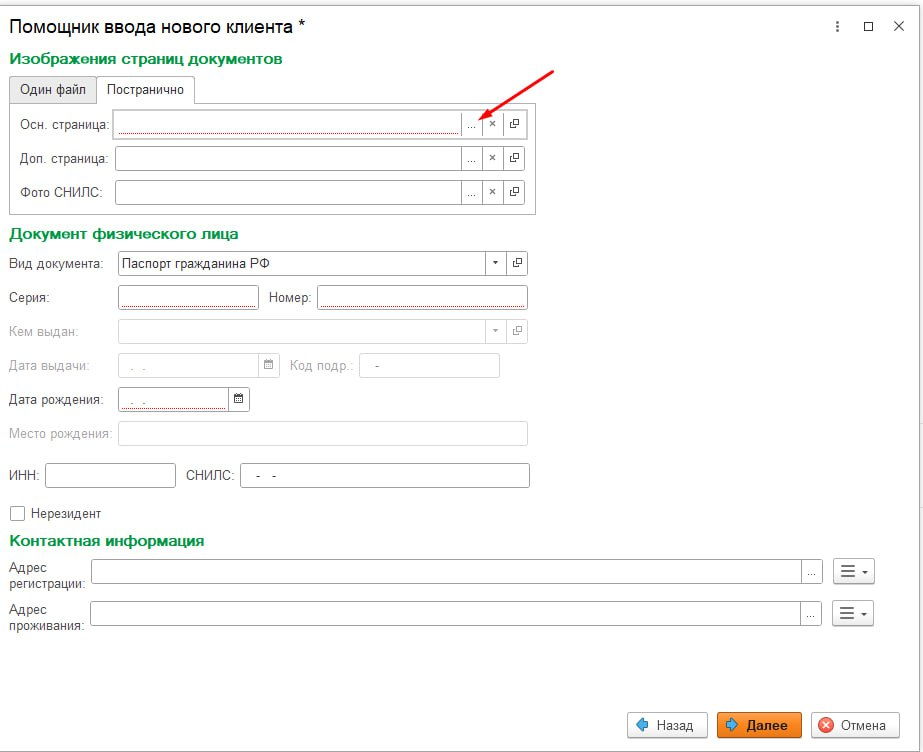- После успешного распознавания поля в разделе "Документ физического лица" (и в документе Клиент) автоматически заполняться: Серия, Номер, Дата выдачи, Кем выдан, Место рождения, Дата рождения, ИНН, СНИЛС.