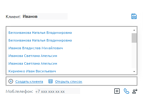 Нажимаем на поле «ФИО клиента». После ввода более 3 символов, появляется подсказка с данными из справочника «Партнеры»: