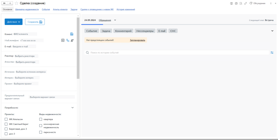 Нажимаем кнопку «Новая сделка» и переходим на форму заполнения данных