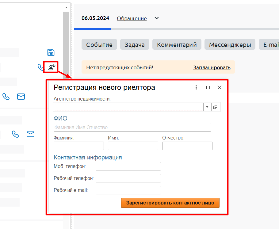 Вводим данные нового риелтора (ФИО, контакты) и нажимаем "зарегистрировать контактное лицо"