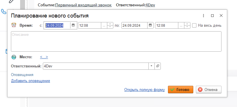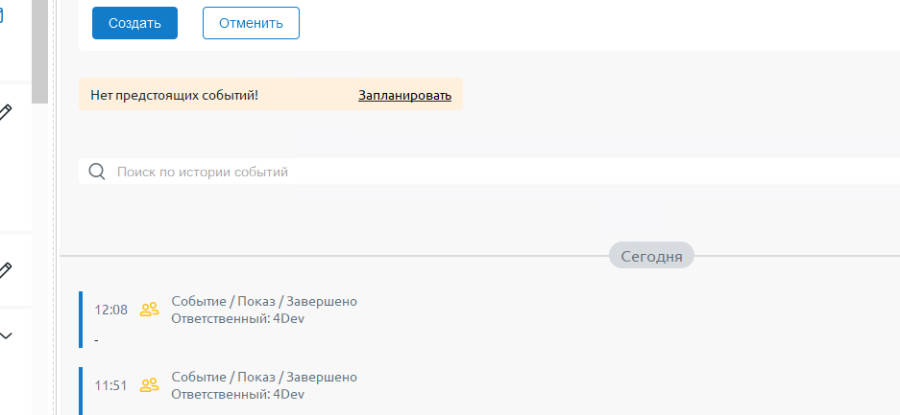 После создания события, на форме сделки появится возможность внести результат этого события, которое обязательно нужно заполнить, иначе в сделке будет отображаться просроченное событие