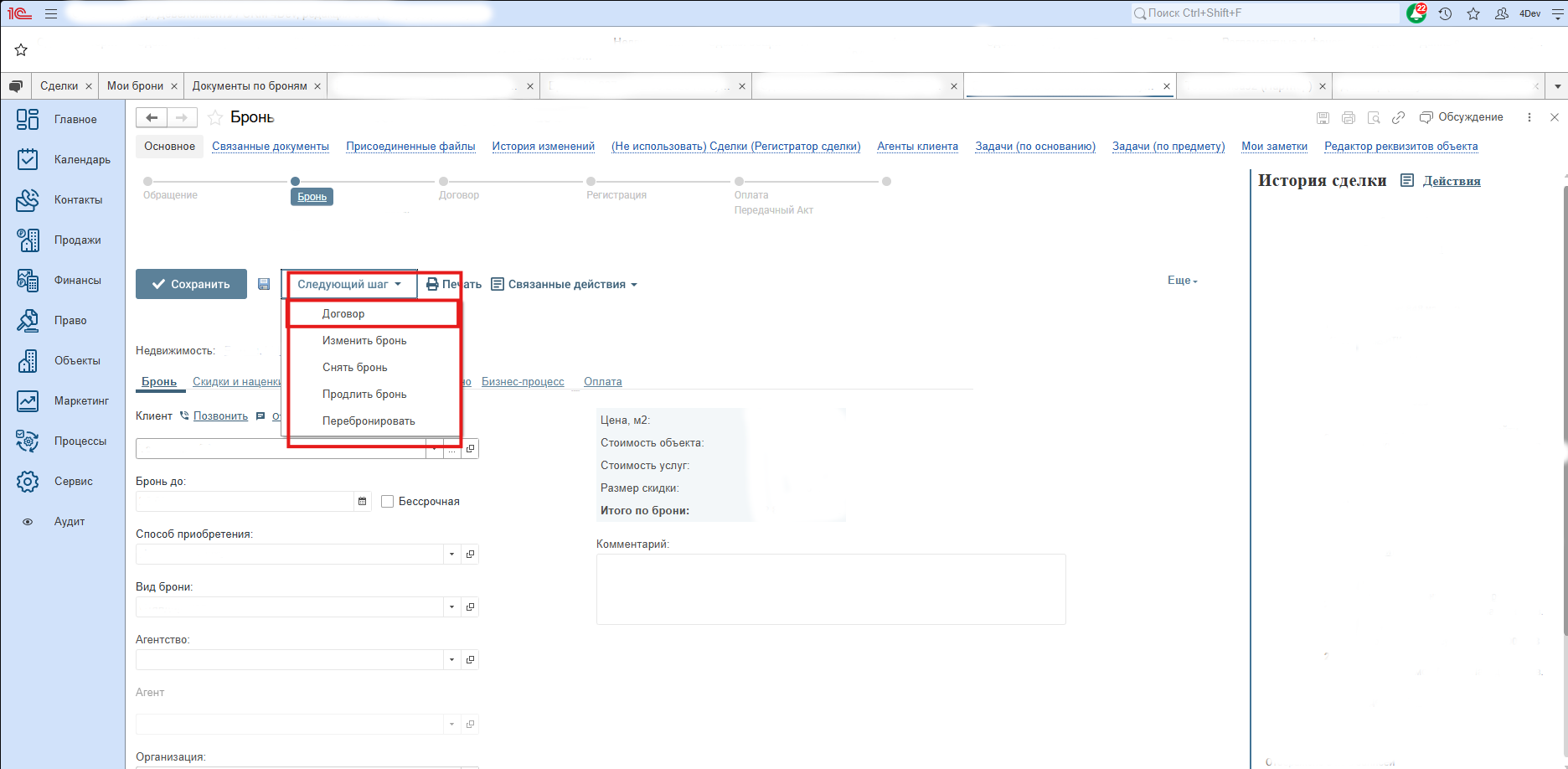 - Нажимаем на кнопку "Следующий шаг", открывается список, в нем нажимаем на "Договор"