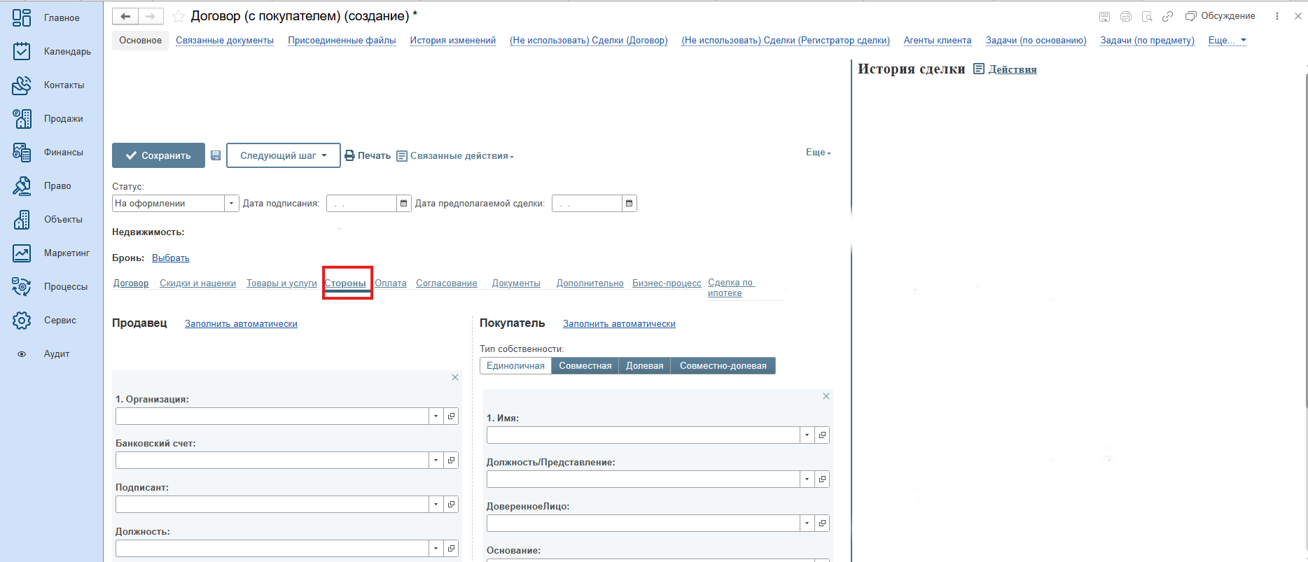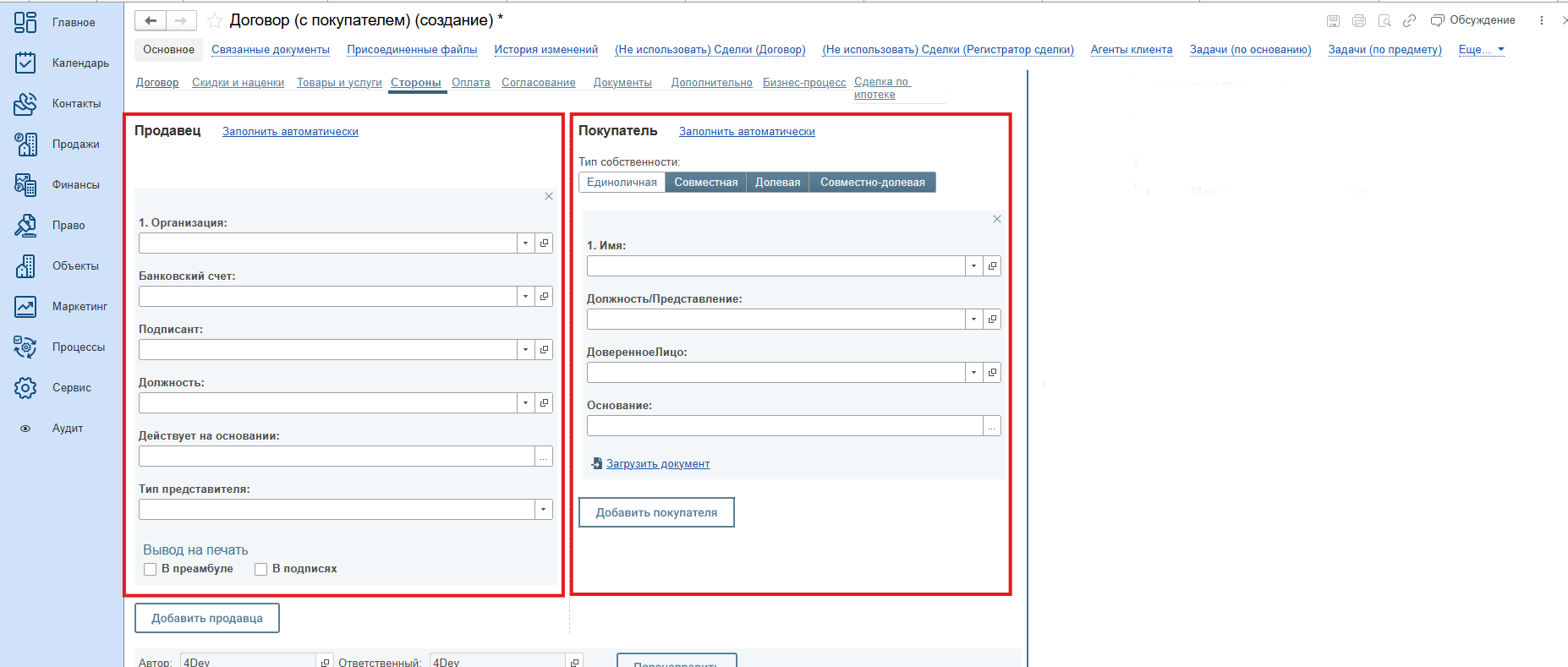 На закладке "Стороны", есть два поля, поле "Продавец" и "Покупатель"