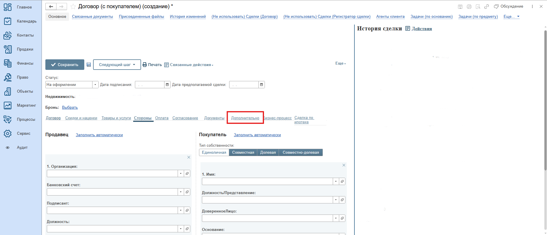 с словом "Договор" появится число, когда был создан договор) - Открываем закладку "Дополнительно"