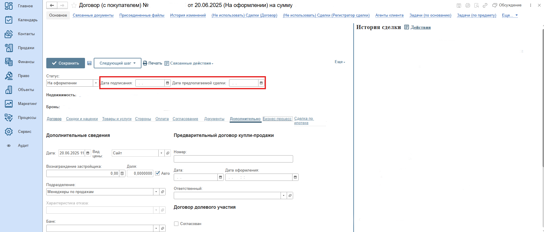и дата изменится. - Теперь мы можем поменять строки "Дата подписания" и "Дата предполагаемой сделки" и